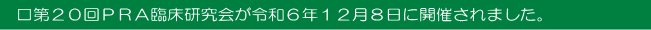 令和6年12月8日、東京国際フォーラムにおいて第20回PRA臨床研究会が開催され、各先生より発表がありました。発表内容は下記の通りです。